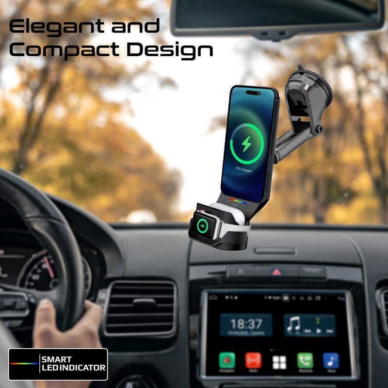 Introducing MagDrive-Trio, the ultimate 3-in-1 car charging station designed to meet all your on-the-go power needs whilst driving. With its versatile mounting options for your windshield, dashboard, or AC vent, MagDrive-Trio keeps your devices within reach while driving. MagSafe compatibility ensures seamless attachment for your iPhone, while the 15W wireless phone charger keeps it powered up fast. Additionally, with a 4.5W wireless AirPods charger and a 3.5W wireless watch charger, you can keep all your essential Apple devices charged simultaneously. Its elegant design complements any car interior, and the colorful LED light indicator adds a nice ambiance. Plus, with a 1m cable included, you have everything you need for a clutter-free charging experience on the road. MagDrive-Trio: where versatility and convenience converge.